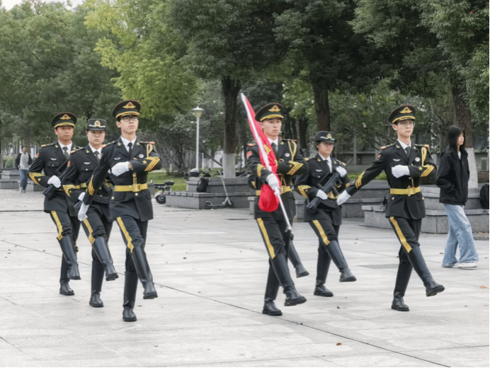 主持人康昭宣布升旗仪式正式开始。随着指挥员的口令,护卫队踏着《分列式进行曲》的节拍,迈出了第一步。他们的步伐铿锵有力,手臂前后摆动,角度精准划一。擎旗手右臂扬起,五星红旗被展向空中,迎风展开。 国歌奏响,全体师生行注目礼。