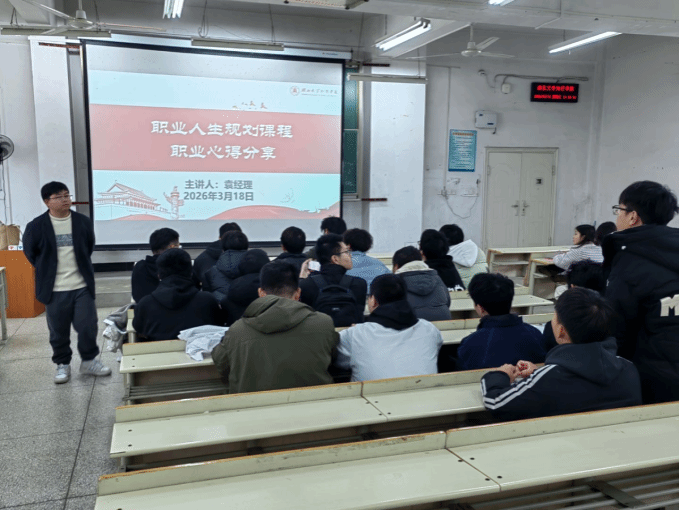 为帮助学生明晰职业发展方向,提升职业规划能力,2026 年 3 月 18 日,湖北大学知行学院生物与化学工程学院特邀湖北新轩宏新材料有限公司袁经理,为学院学子开展 “职业人生规划课程 —— 职业心得分享会”。学院师生代表齐聚课堂,共同聆听这场干货满满的职业成长分享。